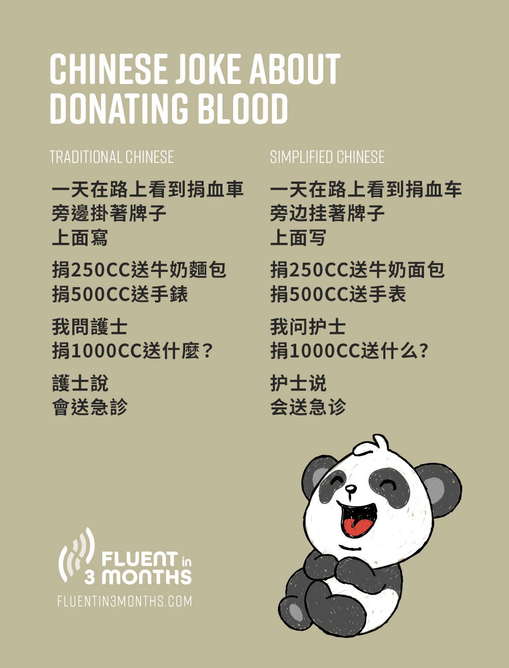 The cool thing about this joke is it demonstrates two different meanings of the word 送(sòng). On the one hand, it can mean to give a gift, like in the case of the rewards given for donating blood. On the other hand, it can mean “to take,” as in to drive someone to the hospital or to the airport.