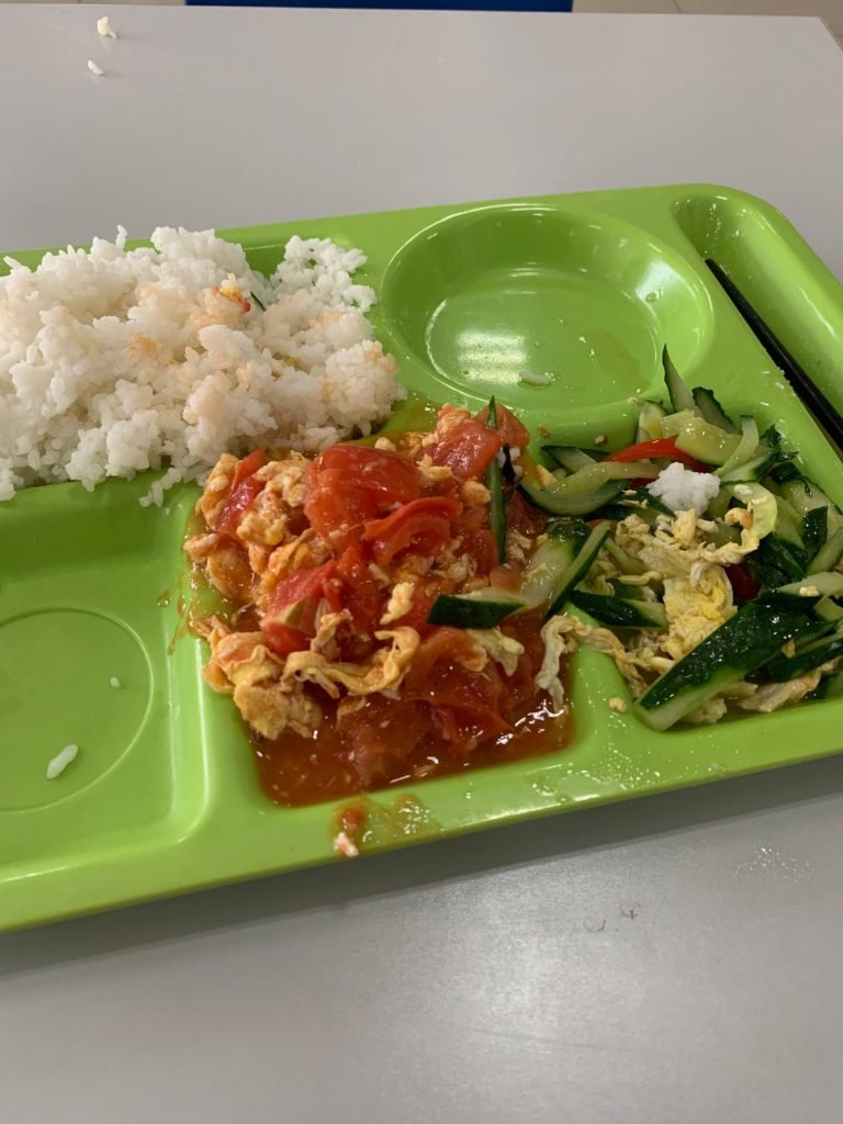 One popular, if simple, dish is 番茄炒蛋 (fān qié chǎo dàn), tomato with scrambled eggs. The picture below shows a side of tomato and eggs I had for lunch at a student cafeteria in China:
