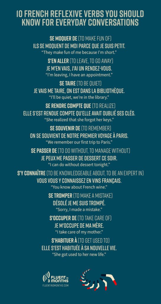 The more you watch French movies, listen to French songs, and immerse yourself in the language, the easier it will be to know when to use reflexive verbs and how to conjugate them. Practice makes perfect may be cliché advice, but in this context, it’s true!