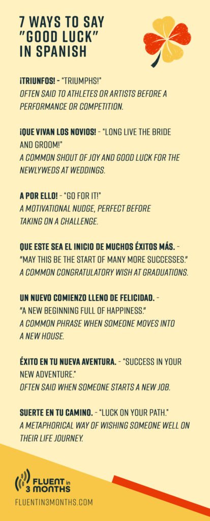 Of course, there’s so much more Spanish than just buena suerte! The list of well-wishing can go on and on, but here are some of the most common ways to wish someone good luck.