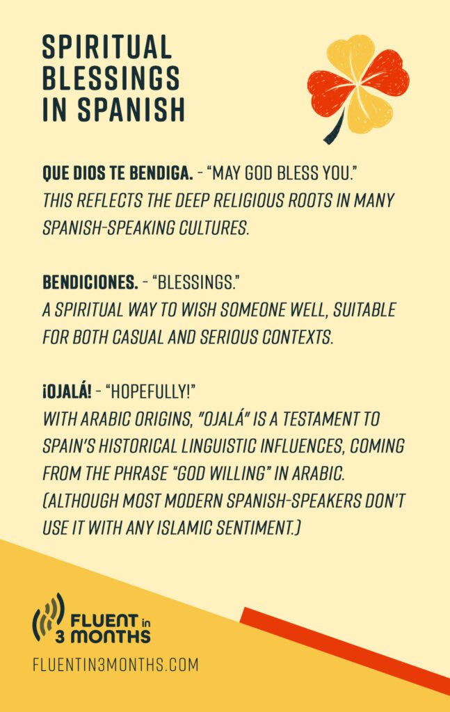 - Bendiciones. – “Blessings.” A spiritual way to wish someone well, suitable for both casual and serious contexts.