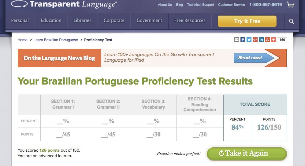 I did an online Portuguese placement test and scored 126/150, or 84%! The test placed me as an advanced learner! Maybe I am a B2 after all! Though I really only feel like a B1.