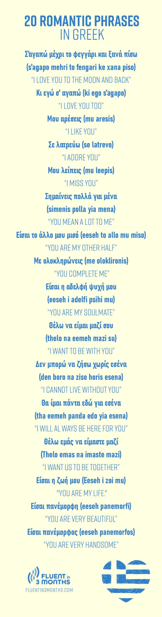 Besides these romantic phrases, you might also want to know how to say girlfriend and boyfriend in Greek and learn new words that would be useful for a date and beyond.
