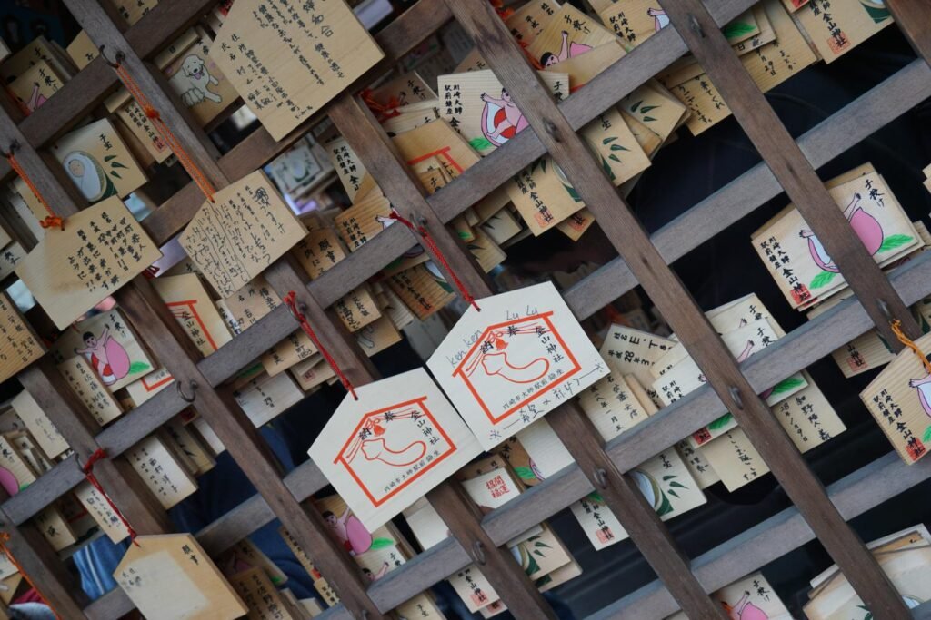 The shrine has a sense of humor. Even the ema (絵馬) – decorated wooden boards on which you write a wish – are ostentatiously true to the theme: