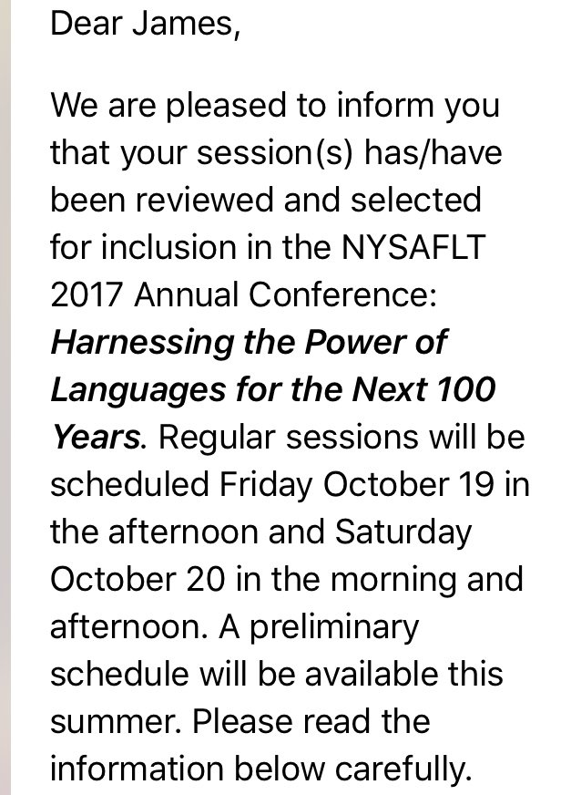 It was mid-May, a long time since I had even thought about my presentation, which was submitted in early January. Scrolling through my email, I was stunned. I received the following email from NYSAFLT: