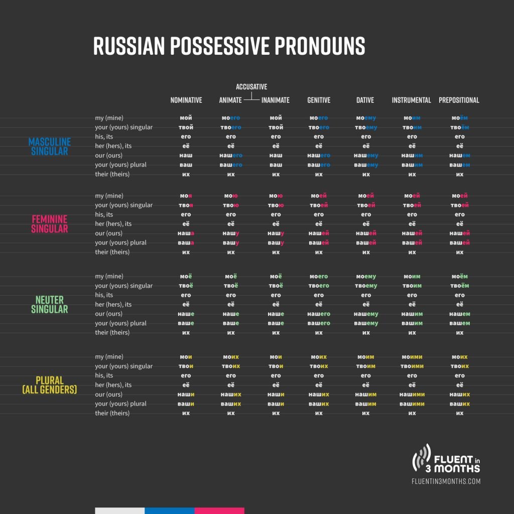 The problem with Russian is that it has six declensions: Nominative, Accusative, Prepositional, Genitive, Dative, and Instrumental. If you've ever studied Latin, German or another Slavic language you're probably familiar with these.
