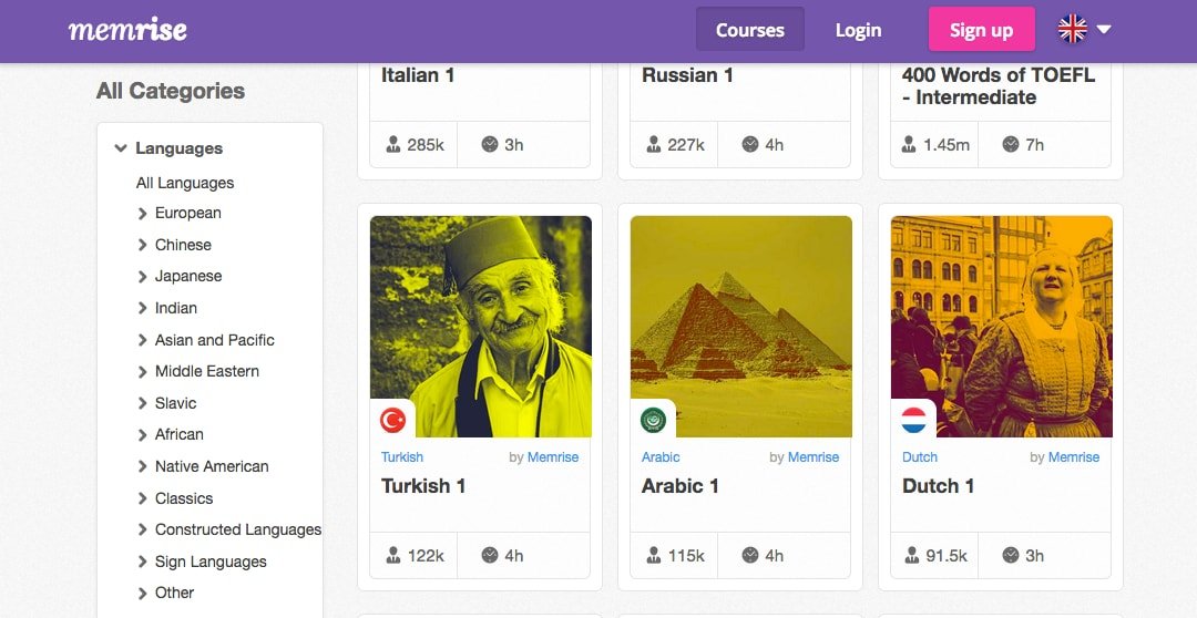 - Memrise. Memrise is a flashcard-based learning system that encourages its users to create courses, so it includes many less commonly taught languages. You can search for your target language using their search function. You can also view all of their possible language decks by clicking on the “Languages” bar on the left-hand side of the screen, and then sorting by origin or language family. Memrise decks usually include audio, and some include visuals as well.