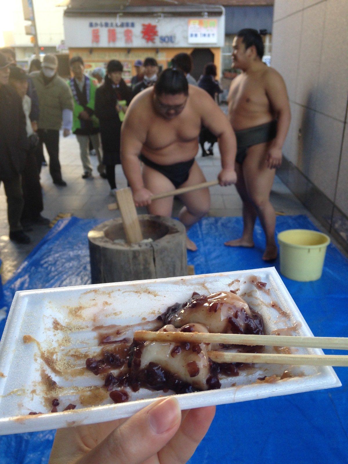 Mochi, or pounded rice cakes, are commonly made and eaten around this time too. (Sometimes, they’ll be pounded by sumo wrestlers!) Although take care when you eat fresh mochi, since a few people (usually elderly) die every year choking on it. You may have also seen 鏡餅 (kagami mochi), which is two mochi topped with a tangerine leaf. This is purely decorational though–don’t try to eat it!