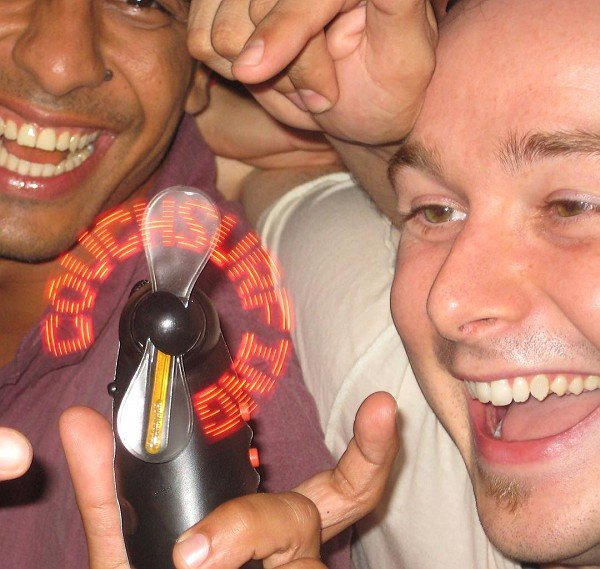 - Apps on my smartphone: Most apps on iPhones (and some on Android) are quite silly and pointless, but I have found a few that have genuinely had strangers come up to me to start conversations. These include a basic LED-esque display app that scrolls a message across the screen. I use it to find Couchsurfers when at meetings at crowded locations (message “Couchsurfing” on screen and I hold it up) and usually people who didn't even know about the meeting start talking to me because of that app. Then there are lots of other cool apps too. Before I had a smartphone I did the same with an LED fan.