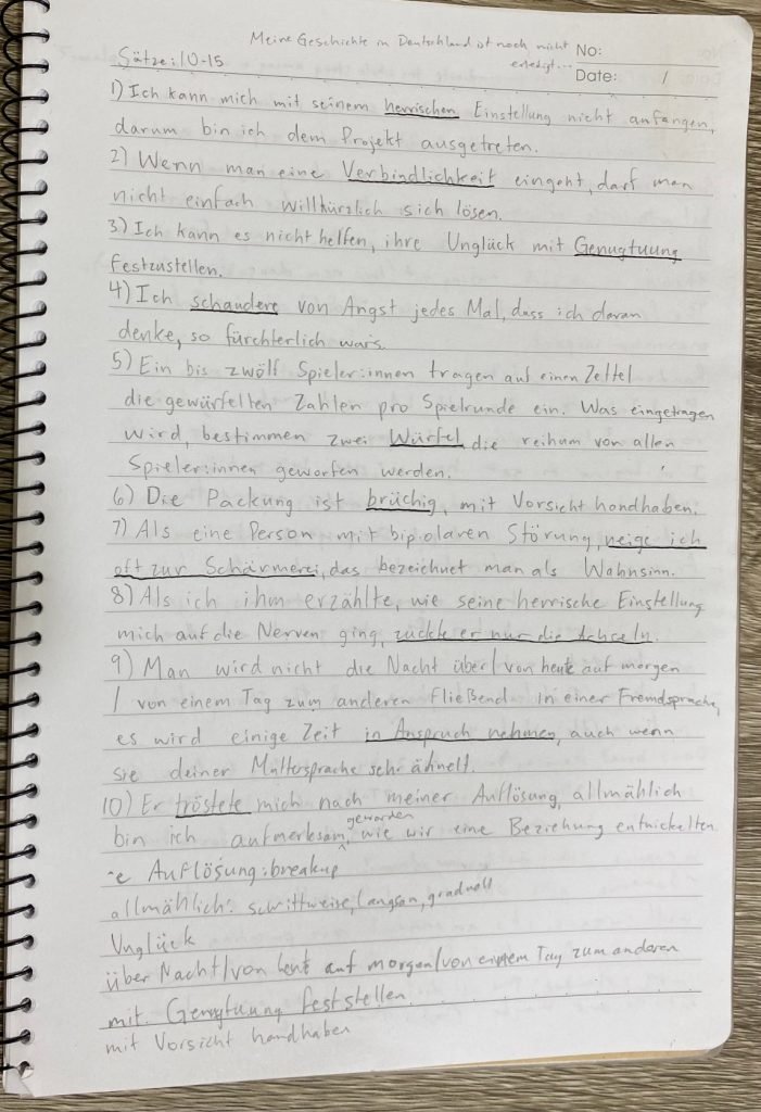 These are sentences I wrote based on vocabulary words in a German novel I read recently, Blaupause. At the bottom, I wrote phrases that I had to look up while writing my sentences. Writing sentences is a great way to make passive vocabulary knowledge more active!