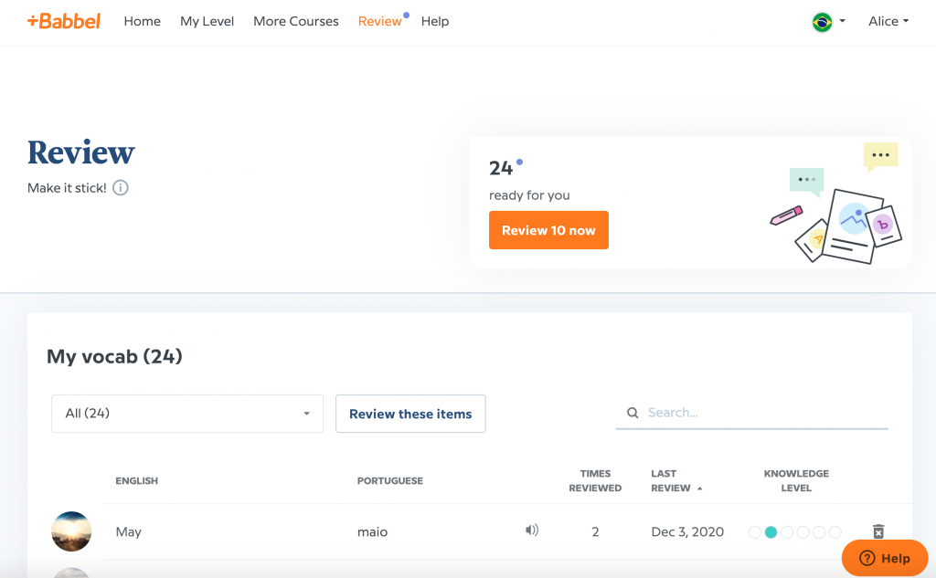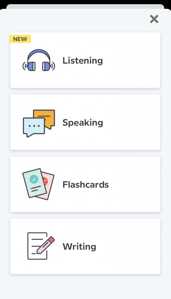 Babbel’s programme pushes you to review at least ten words or phrases every day. To make sure that your review is as effective as possible, Babbel lets you choose the review technique you prefer.