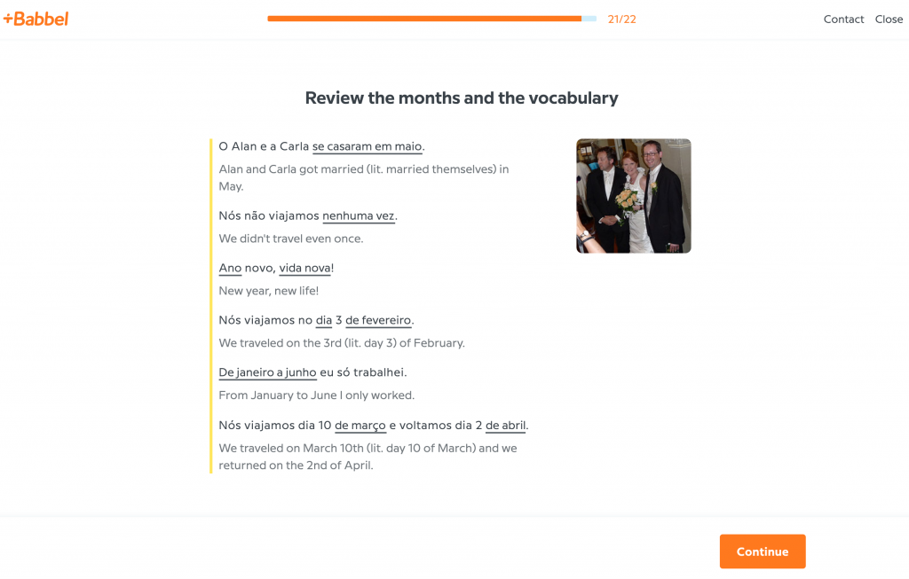 It uses a blended approach to learning. While using Babbel’s Portuguese course, I have practiced:
