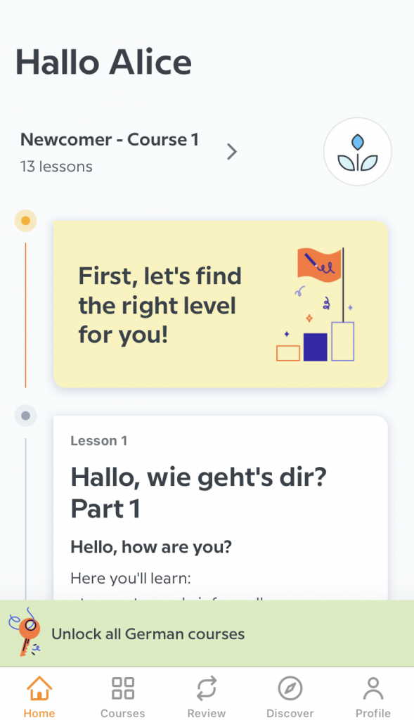 Babbel is both a language e-learning platform and a language learning app. It offers courses at newcomer, beginner I, beginner II, pre-intermediate, and intermediate levels. It doesn’t currently go to advanced levels.