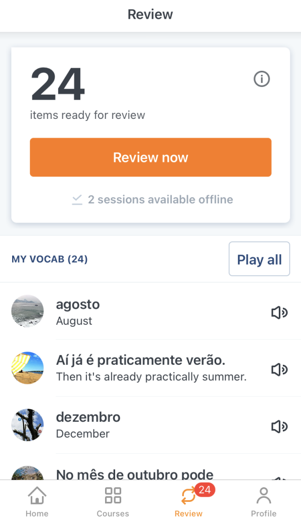 You can choose between flashcard review, “type in” review, speaking review, and identifying review.
