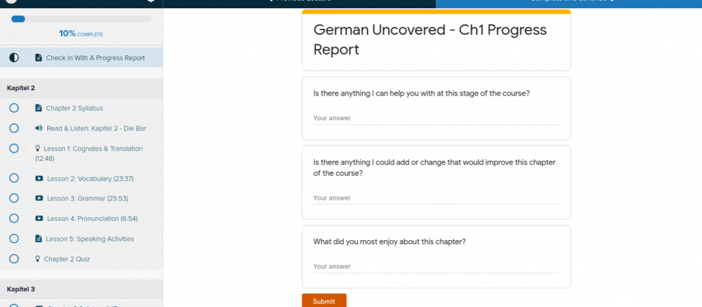 With German Uncovered, you don’t need to plan for your lessons. Simply share the document for the chapter you have studied. Your tutor can take it from there. It really takes the pressure off of deciding what to discuss.