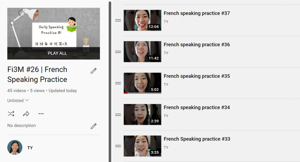 In all my 45 videos, I started with “Coucou tout le monde, c’est ma …… vidéo.” (“Hello everyone, this is my ……video”).